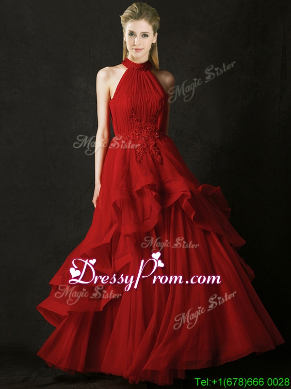 Neckline : Halter topShown Color : RedSilhouette : A-lineSleeve Length : sleevelessHemline : floor lengthBack Detail : ZipperFabric : TulleEmbellishment : AppliquesOccasion : Prom,Party,Cocktail,Homecoming,GraduationSeason : Spring,Summer,Fall,Winter
