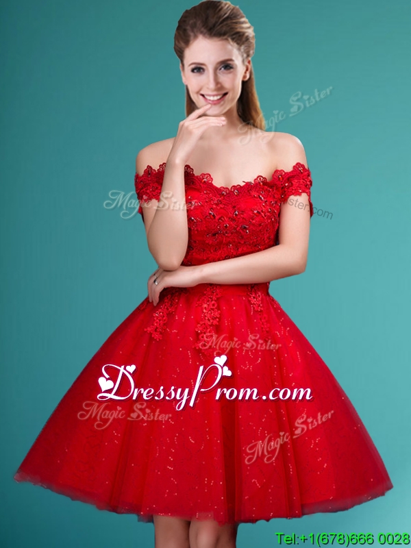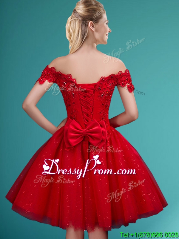 Neckline : Off the shoulder Shown Color : Red Silhouette : A-line Sleeve Length : cap sleeves Hemline : mini length Back Detail : Lace up Fabric : Tulle Embellishment : Beading,Appliques,Bowknot Occasion : Prom,Party,Cocktail,Homecoming,Graduation Season : Spring,Summer,Fall