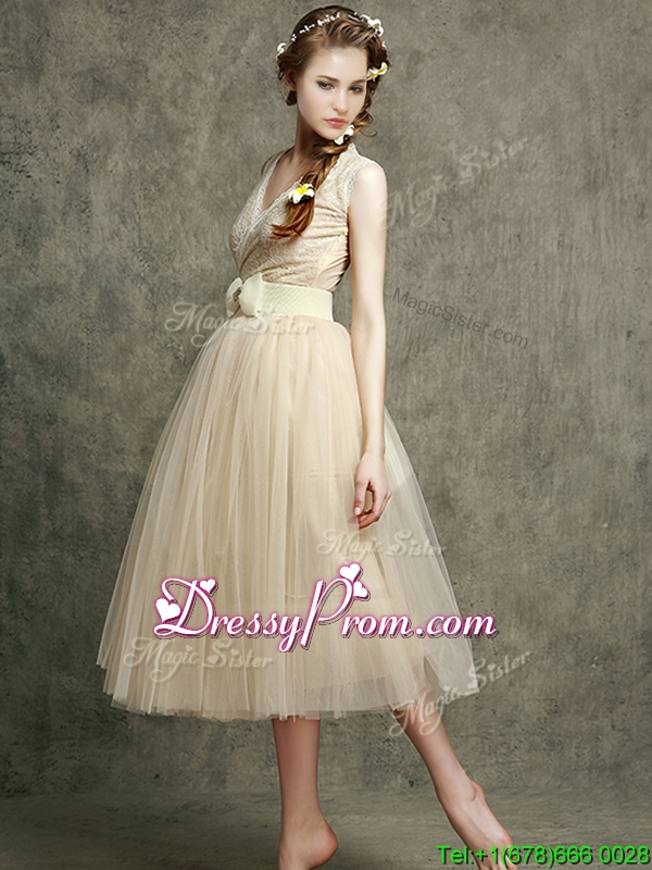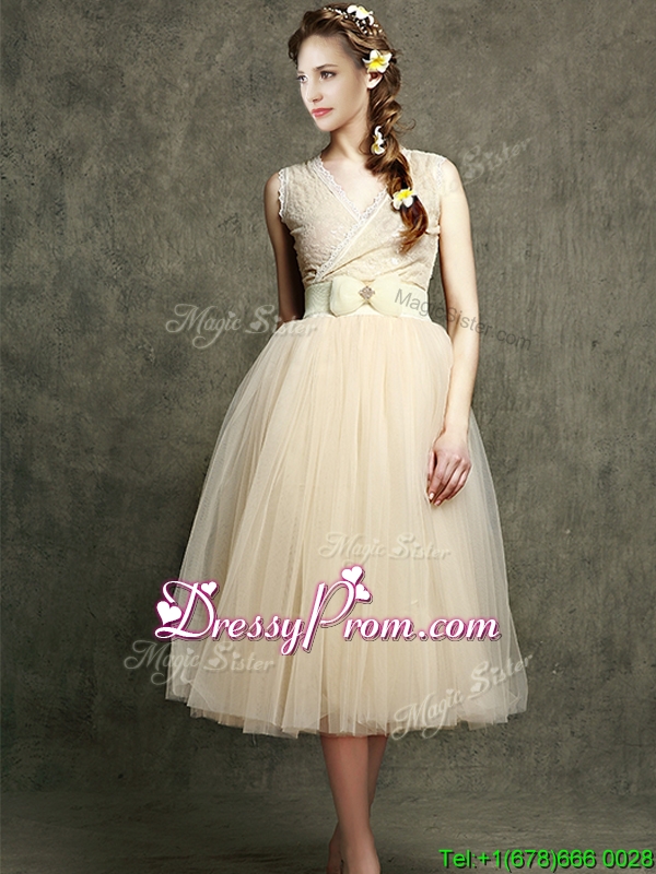 Neckline : V-neckShown Color : ChampagneSilhouette : A-lineSleeve Length : sleevelessHemline : tea lengthBack Detail : ZipperFabric : TulleEmbellishment : Bowknot,BeltOccasion : Prom,Party,Cocktail,Homecoming,GraduationSeason : Spring,Summer,Fall,Winter