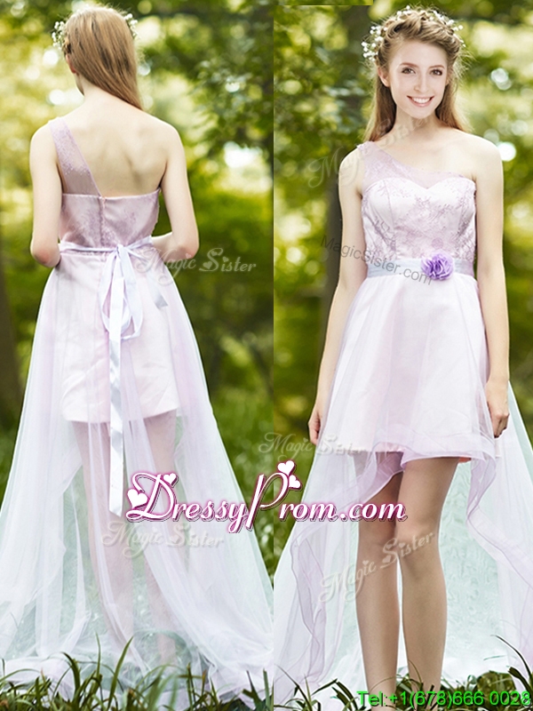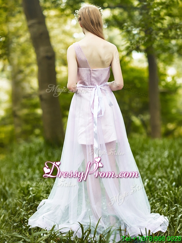 Neckline : Off the shoulderShown Color : LavenderSilhouette : A-lineSleeve Length : sleevelessHemline : with trainBack Detail : ZipperFabric : TulleEmbellishment : Lace,Sashes|ribbonsOccasion : Prom,Party,Cocktail,Homecoming,GraduationSeason : Spring,Summer,Fall