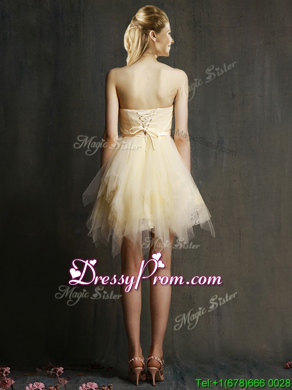 Neckline : SweetheartShown Color : ChampagneSilhouette : A-lineSleeve Length : sleevelessHemline : mini lengthBack Detail : Lace upFabric : TulleEmbellishment : Ruffles,BeltOccasion : Prom,Party,Cocktail,Homecoming,GraduationSeason : Spring,Summer,Fall,Winter