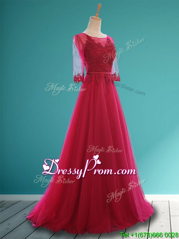 Neckline : ScoopShown Color : Wine RedSilhouette : A-lineSleeve Length : half sleevesHemline : floor lengthBack Detail : Lace upFabric : TulleEmbellishment : Appliques,BeltOccasion : Prom,Party,Cocktail,Homecoming,GraduationSeason : Spring,Summer,Fall,Winter