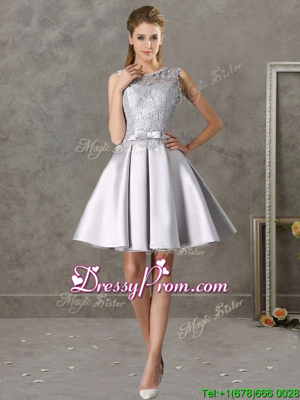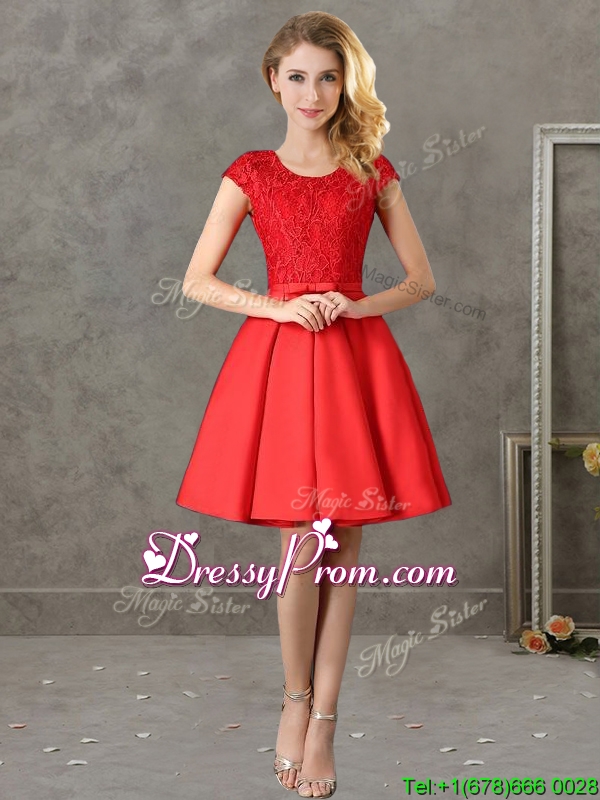 Neckline : ScoopShown Color : Red,SilverSilhouette : A-lineSleeve Length : cap sleevesHemline : mini lengthBack Detail : ZipperFabric : SatinEmbellishment : Lace,BowknotOccasion : Prom,Party,Cocktail,Homecoming,GraduationSeason : Spring,Summer,Fall