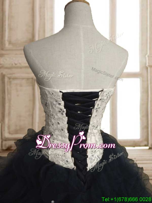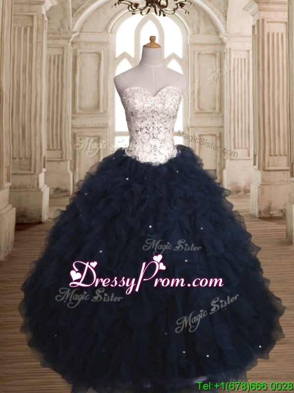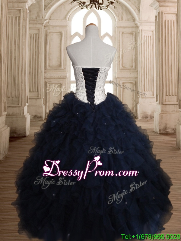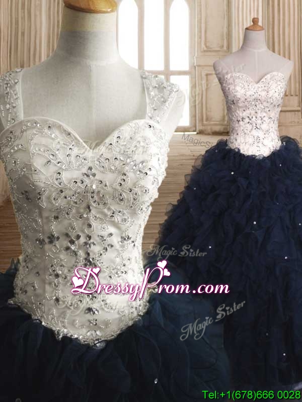Neckline : StrapsShown Color : White,Navy BlueSilhouette : Ball GownsSleeve Length : sleevelessHemline : floor lengthBack Detail : Lace upFabric : OrganzaEmbellishment : Beading,RufflesOccasion : Military Ball,Sweet 16,QuinceaneraSeason : Spring,Summer,Fall,Winter