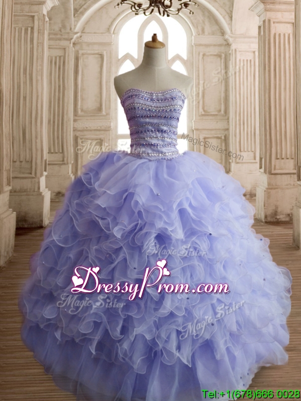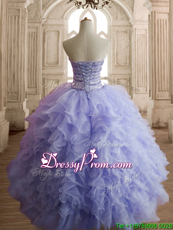 Neckline : SweetheartShown Color : LavenderSilhouette : Ball GownsSleeve Length : sleevelessHemline : floor lengthBack Detail : Lace upFabric : OrganzaEmbellishment : Beading,RufflesOccasion : Military Ball,Sweet 16,QuinceaneraSeason : Spring,Summer,Fall,Winter