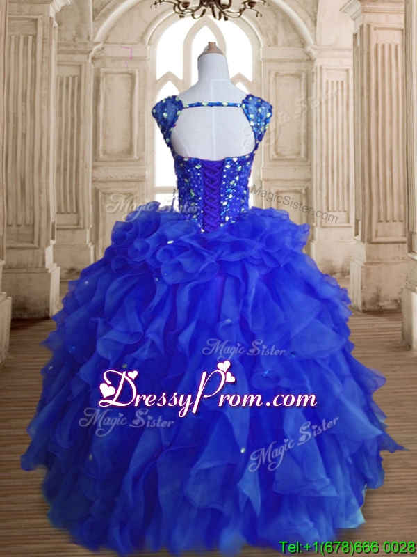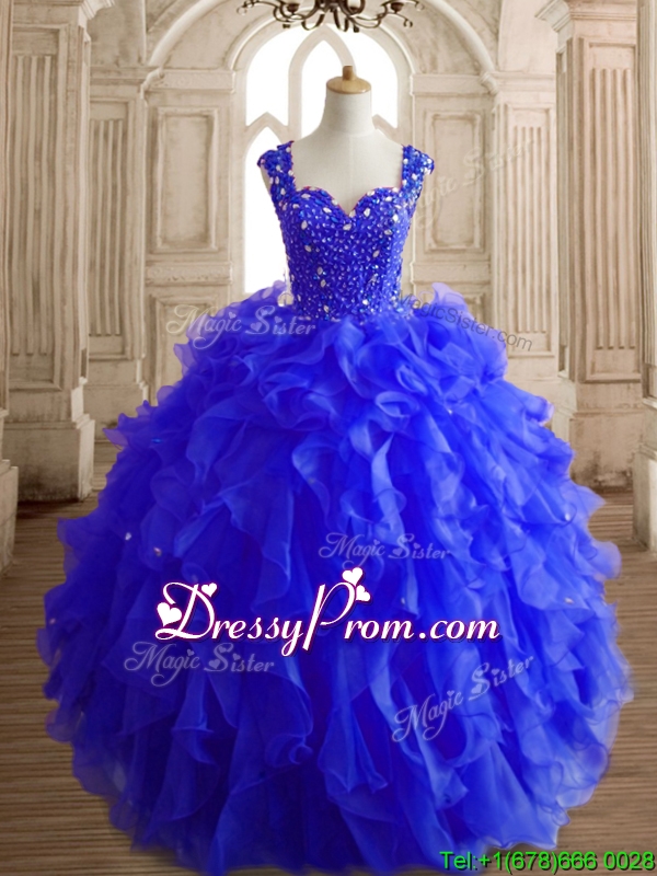 Neckline : StrapsShown Color : Royal BlueSilhouette : Ball GownsSleeve Length : sleevelessHemline : floor lengthBack Detail : Lace upFabric : OrganzaEmbellishment : Beading,RufflesOccasion : Military Ball,Sweet 16,QuinceaneraSeason : Spring,Summer,Fall,Winter