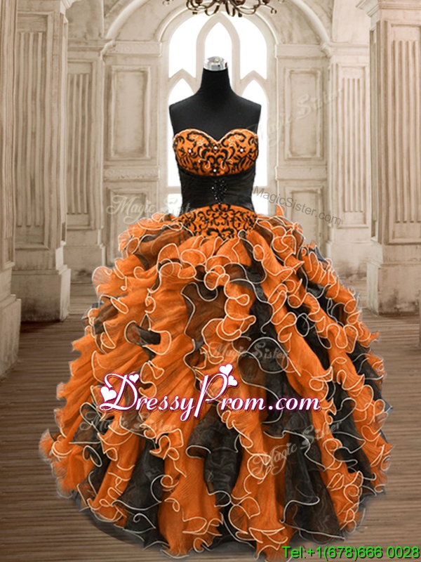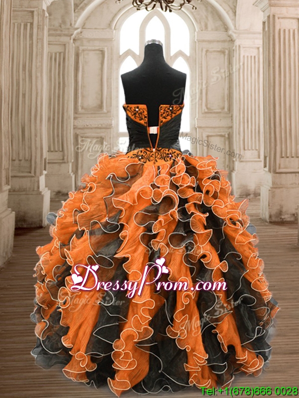 Neckline : SweetheartShown Color : Black,OrangeSilhouette : Ball GownsSleeve Length : sleevelessHemline : floor lengthBack Detail : BacklessFabric : OrganzaEmbellishment : Beading,RufflesOccasion : Military Ball,Sweet 16,QuinceaneraSeason : Spring,Summer,Fall,Winter