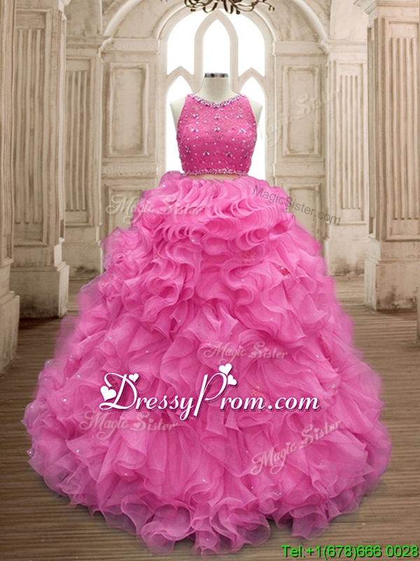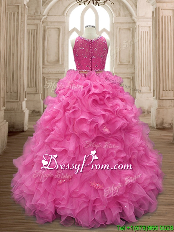 Neckline : ScoopShown Color : Hot PinkSilhouette : Ball GownsSleeve Length : sleevelessHemline : floor lengthBack Detail : Clasp handleFabric : OrganzaEmbellishment : Beading,RufflesOccasion : Military Ball,Sweet 16,QuinceaneraSeason : Spring,Summer,Fall,Winter