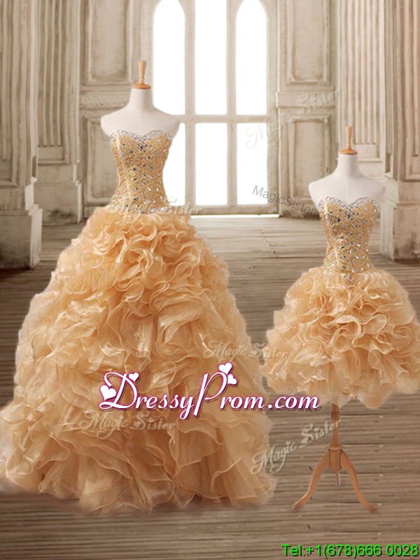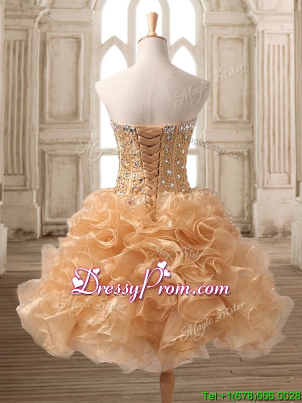 Neckline : SweetheartShown Color : GoldSilhouette : Ball GownsSleeve Length : sleevelessHemline : floor lengthBack Detail : Lace upFabric : OrganzaEmbellishment : Beading,RufflesOccasion : Military Ball,Sweet 16,QuinceaneraSeason : Spring,Summer,Fall,Winter