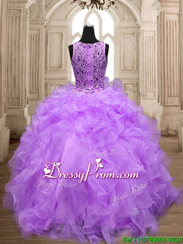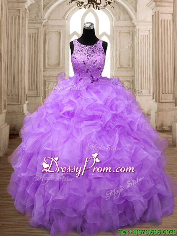 Neckline : ScoopShown Color : LavenderSilhouette : Ball GownsSleeve Length : sleevelessHemline : floor lengthFabric : OrganzaEmbellishment : Beading,RufflesOccasion : Military Ball,Sweet 16,QuinceaneraSeason : Spring,Summer,Fall,Winter