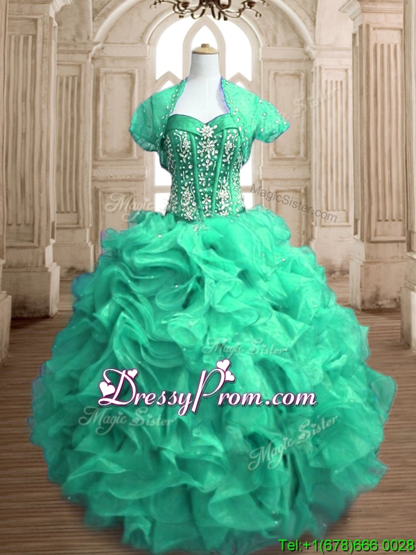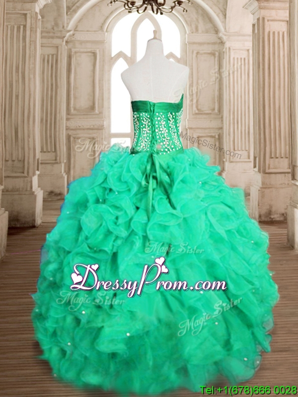 Neckline : SweetheartShown Color : TurquoiseSilhouette : MermaidSleeve Length : sleevelessHemline : floor lengthBack Detail : Lace upFabric : OrganzaEmbellishment : Beading,RufflesOccasion : Military Ball,Sweet 16,QuinceaneraSeason : Spring,Summer,Fall,Winter