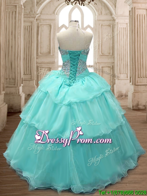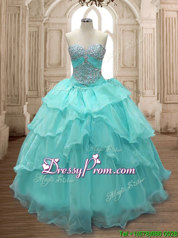 Neckline : SweetheartShown Color : Aqua BlueSilhouette : Ball GownsSleeve Length : sleevelessHemline : floor lengthBack Detail : Lace upFabric : OrganzaEmbellishment : Beading,Ruffled LayersOccasion : Military Ball,Sweet 16,QuinceaneraSeason : Spring,Summer,Fall,Winter