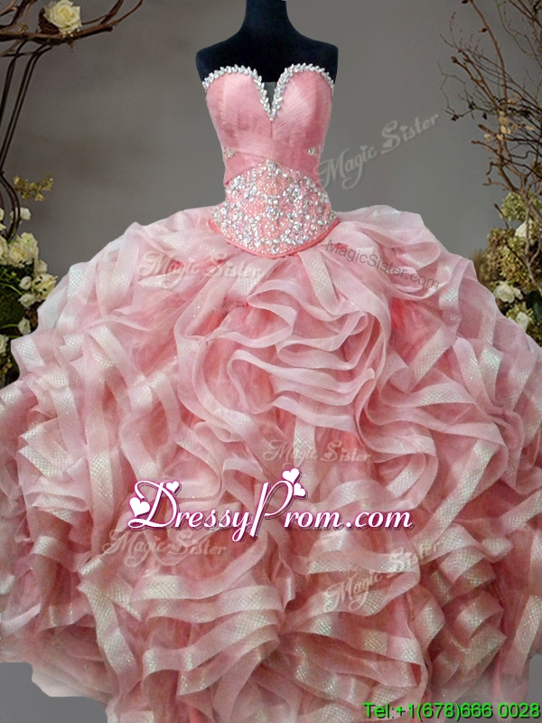 Neckline : SweetheartShown Color : Pink Silhouette : Ball GownsSleeve Length : sleevelessHemline : floor lengthBack Detail : Lace upFabric : OrganzaEmbellishment : Beading,RufflesOccasion : Military Ball,Sweet 16,QuinceaneraSeason : Spring,Summer,Fall,Winter
