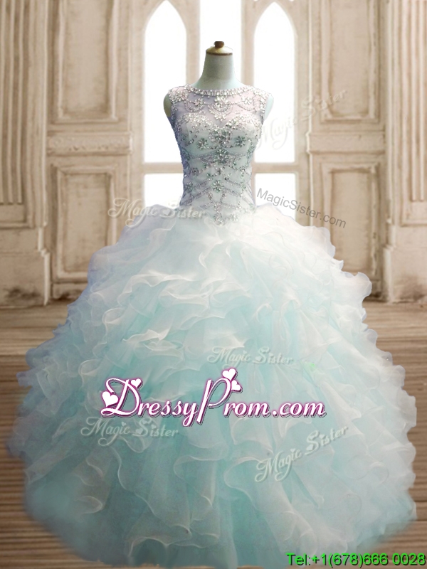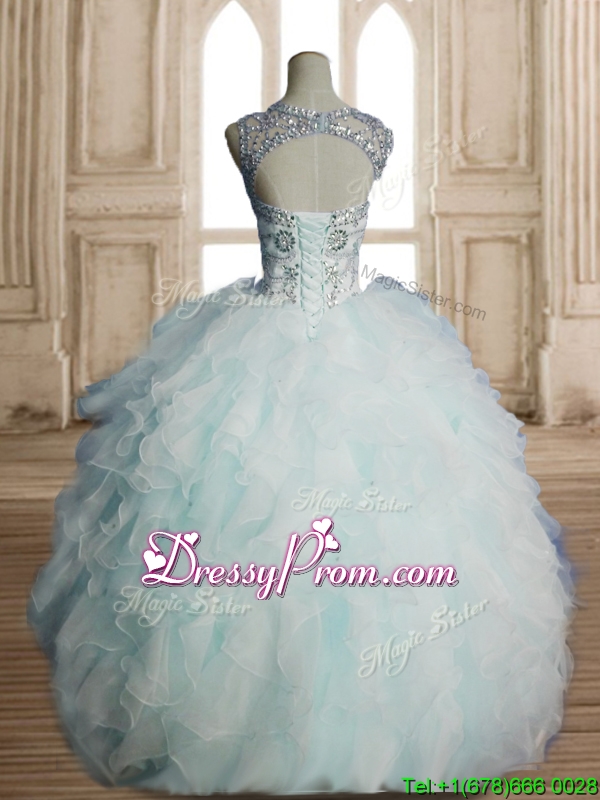 Neckline : ScoopShown Color : Light BlueSilhouette : Ball GownsSleeve Length : sleevelessHemline : floor lengthBack Detail : Lace upFabric : OrganzaEmbellishment : Beading,RufflesOccasion : Military Ball,Sweet 16,QuinceaneraSeason : Spring,Summer,Fall,Winter