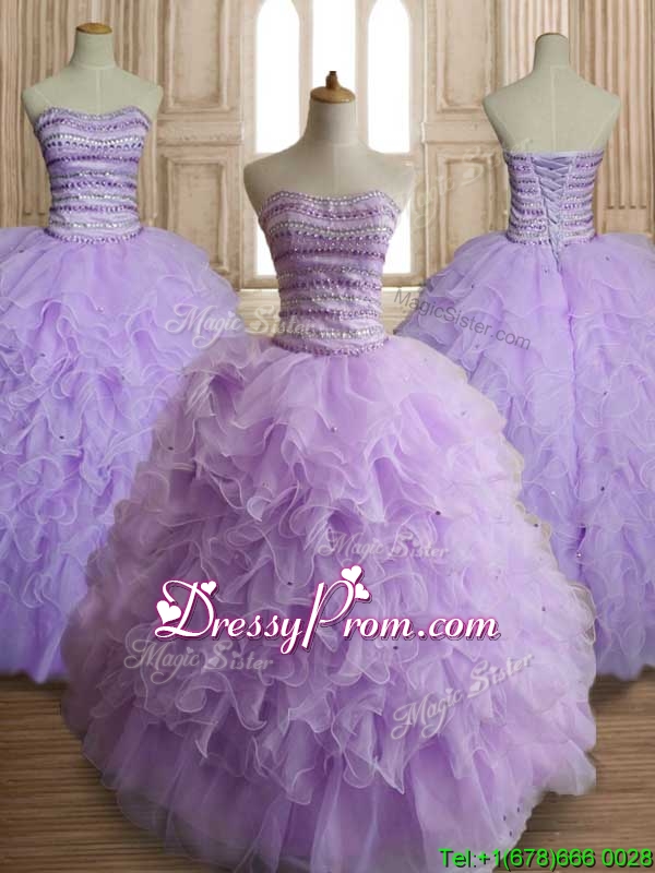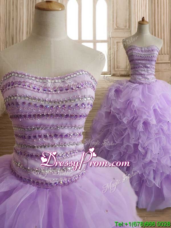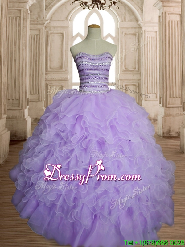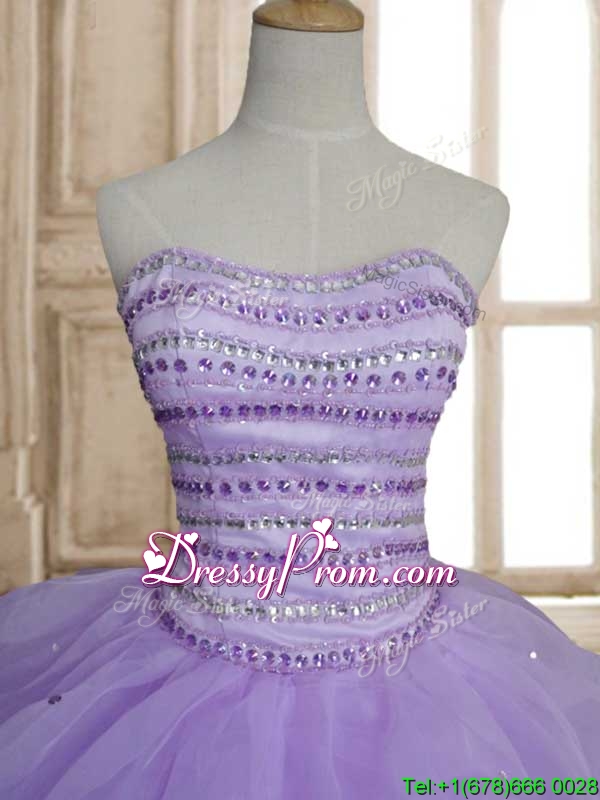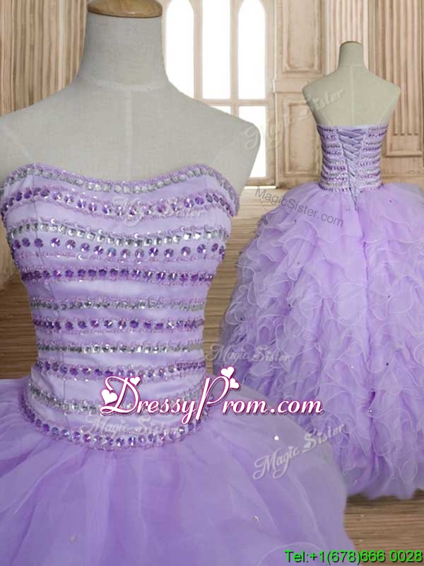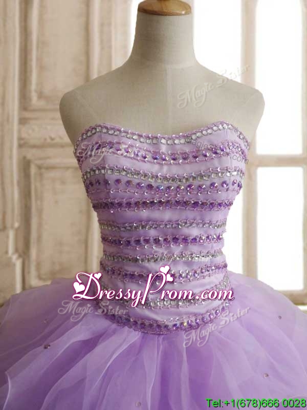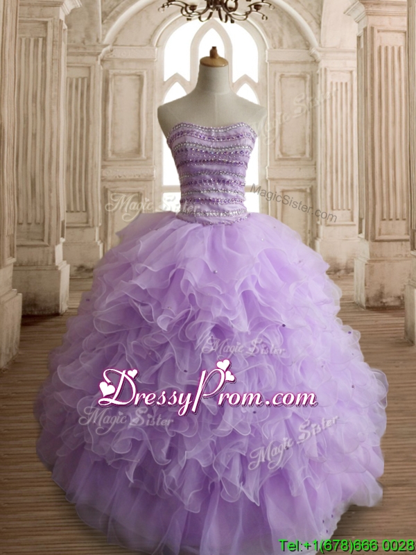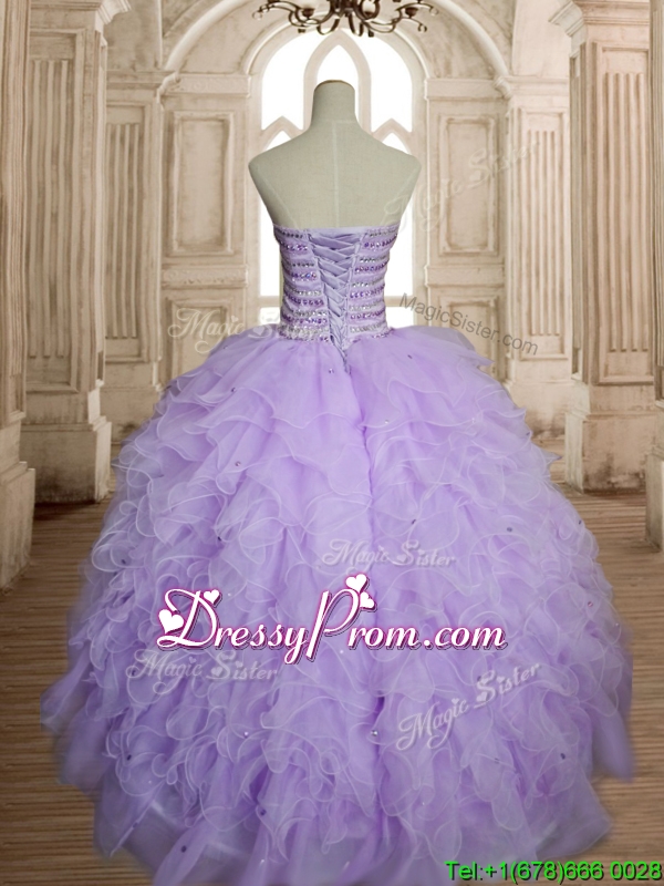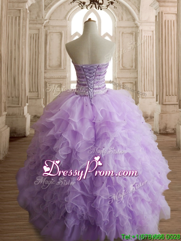 Neckline : SweetheartShown Color : LavenderSilhouette : Ball GownsSleeve Length : sleevelessHemline : floor lengthBack Detail : Lace upFabric : OrganzaEmbellishment : Beading,RufflesOccasion : Military Ball,Sweet 16,QuinceaneraSeason : Spring,Summer,Fall,Winter
