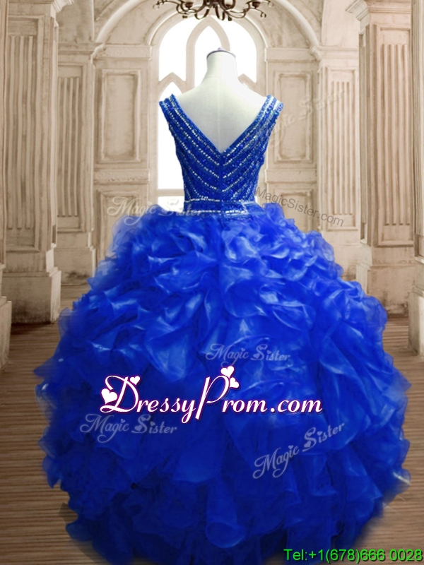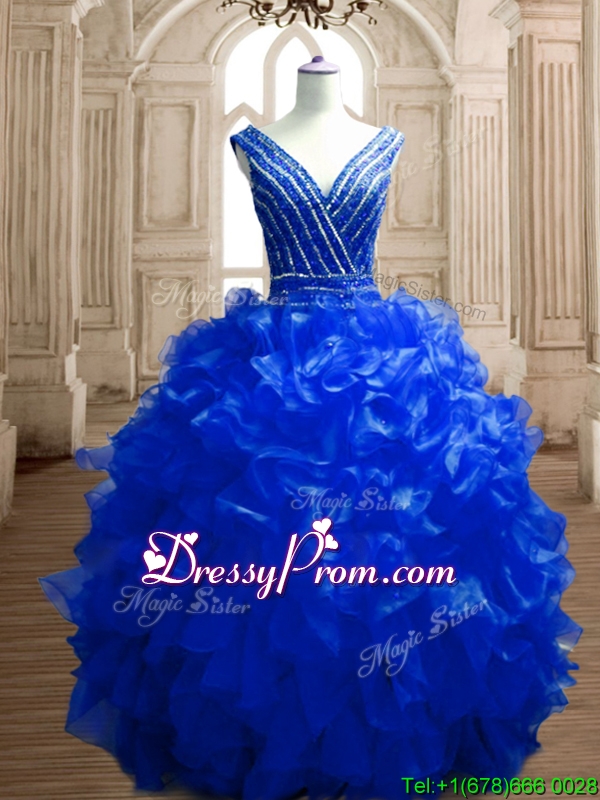Neckline : V-neckShown Color : Royal BlueSilhouette : Ball GownsSleeve Length : sleevelessHemline : floor lengthBack Detail : ZipperFabric : OrganzaEmbellishment : Beading,RufflesOccasion : Military Ball,Sweet 16,QuinceaneraSeason : Spring,Summer,Fall,Winter