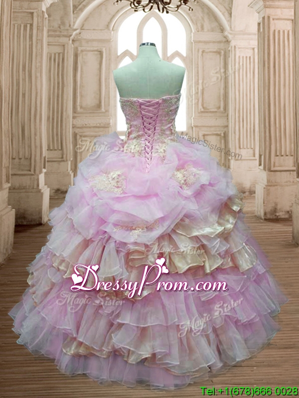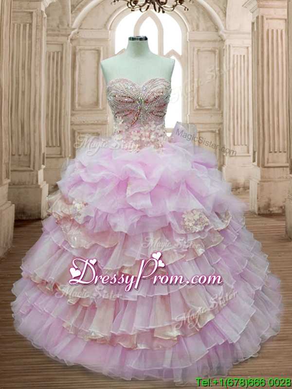 Neckline : SweetheartShown Color : Lilac,ChampagneSilhouette : Ball GownsSleeve Length : sleevelessHemline : floor lengthBack Detail : Lace upFabric : OrganzaEmbellishment : Beading,Appliques,Ruffled Layers,Pick UpsOccasion : Military Ball,Sweet 16,QuinceaneraSeason : Spring,Summer,Fall,Winter