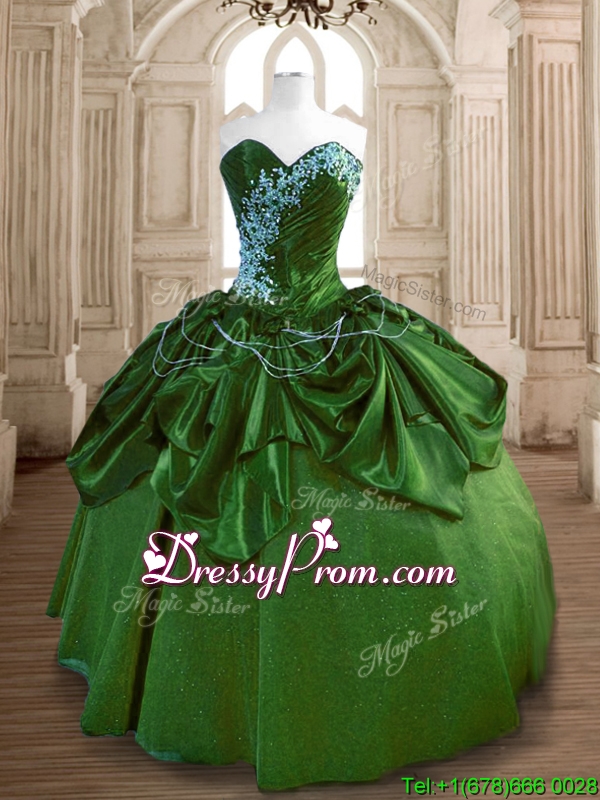 Neckline : SweetheartShown Color : GreenSilhouette : Ball GownsSleeve Length : sleevelessHemline : floor lengthBack Detail : Lace upFabric : TaffetaEmbellishment : Beading,RufflesOccasion : Military Ball,Sweet 16,QuinceaneraSeason : Spring,Summer,Fall,Winter