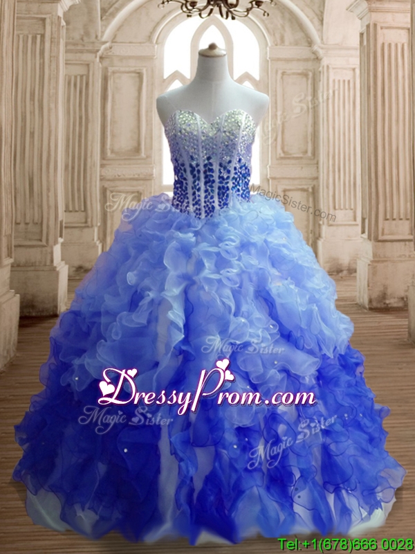 Neckline : SweetheartShown Color : Royal Blue,Light BlueSilhouette : Ball GownsSleeve Length : sleevelessHemline : floor lengthBack Detail : Lace upFabric : OrganzaEmbellishment : Beading,RufflesOccasion : Military Ball,Sweet 16,QuinceaneraSeason : Spring,Summer,Fall,Winter