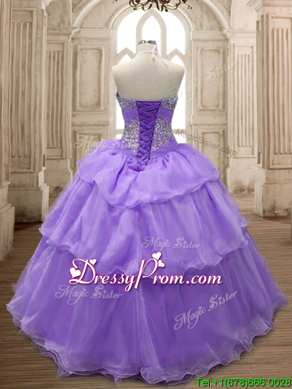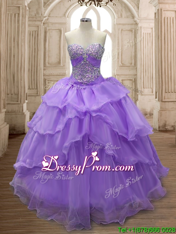 Neckline : SweetheartShown Color : LavenderSilhouette : Ball GownsSleeve Length : sleevelessHemline : floor lengthBack Detail : Lace upFabric : OrganzaEmbellishment : Beading,Ruffled LayersOccasion : Military Ball,Sweet 16,QuinceaneraSeason : Spring,Summer,Fall,Winter