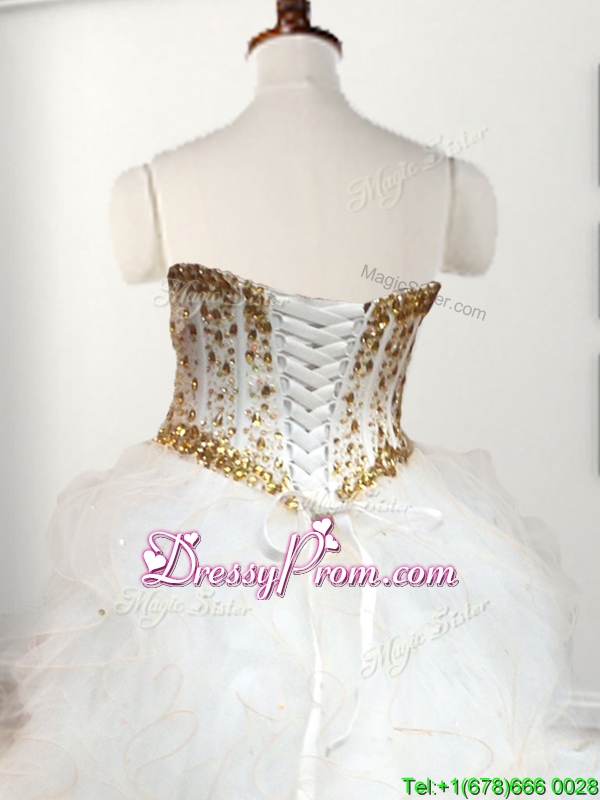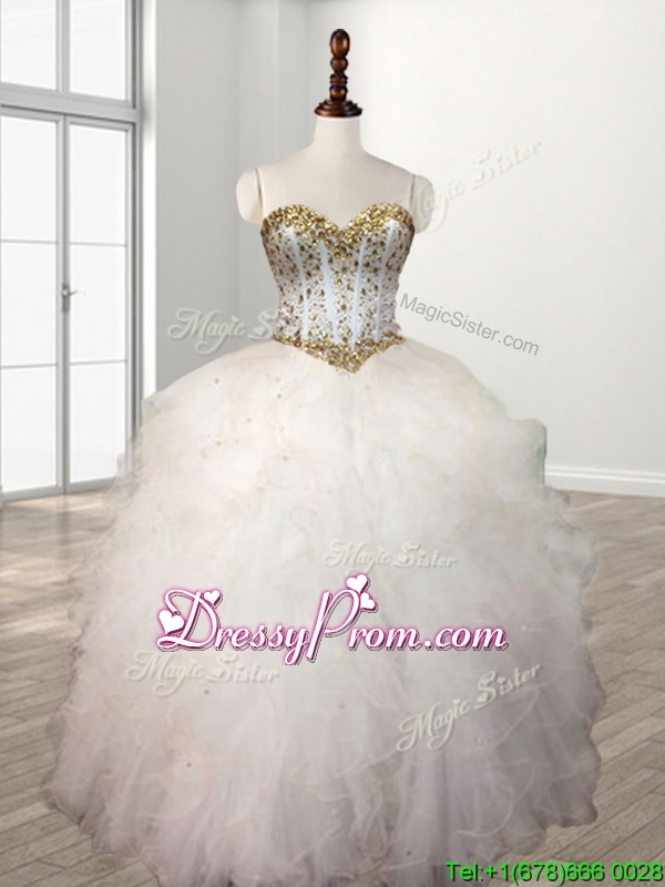 Neckline : SweetheartShown Color : WhiteSilhouette : Ball GownsSleeve Length : sleevelessHemline : floor lengthBack Detail : Lace upFabric : TulleEmbellishment : Beading,RufflesOccasion : Military Ball,Sweet 16,QuinceaneraSeason : Spring,Summer,Fall,Winter
