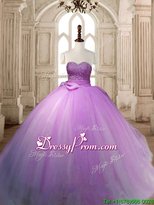 Neckline : SweetheartShown Color : LilacSilhouette : A-lineSleeve Length : sleevelessHemline : floor lengthBack Detail : ZipperFabric : TulleEmbellishment : Beading,BowknotOccasion : Military Ball,Sweet 16,QuinceaneraSeason : Spring,Summer,Fall,Winter