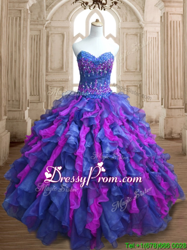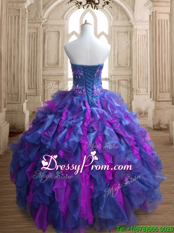 Neckline : SweetheartShown Color : Blue,FuchsiaSilhouette : Ball GownsSleeve Length : sleevelessHemline : floor lengthBack Detail : Lace upFabric : OrganzaEmbellishment : Appliques,RufflesOccasion : Military Ball,Sweet 16,QuinceaneraSeason : Spring,Summer,Fall,Winter