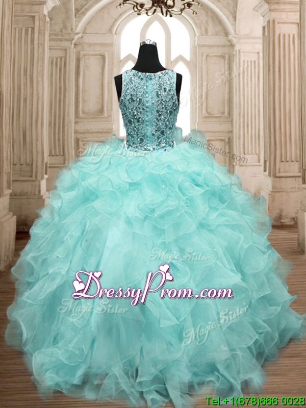 Neckline : ScoopShown Color : Aqua BlueSilhouette : Ball GownsSleeve Length : sleevelessHemline : floor lengthBack Detail : Clasp handleFabric : OrganzaEmbellishment : Beading,RufflesOccasion : Military Ball,Sweet 16,QuinceaneraSeason : Spring,Summer,Fall,Winter