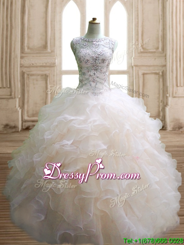 Neckline : ScoopShown Color : ChampagneSilhouette : Ball GownsSleeve Length : sleevelessHemline : floor lengthBack Detail : Lace upFabric : OrganzaEmbellishment : Beading,RufflesOccasion : Military Ball,Sweet 16,QuinceaneraSeason : Spring,Summer,Fall,Winter