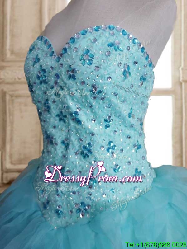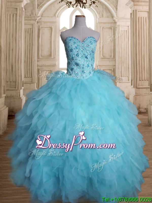 Neckline : SweetheartShown Color : Baby BlueSilhouette : Ball GownsSleeve Length : sleevelessHemline : floor lengthBack Detail : Lace upFabric : TulleEmbellishment : Beading,RufflesOccasion : Military Ball,Sweet 16,QuinceaneraSeason : Spring,Summer,Fall,Winter