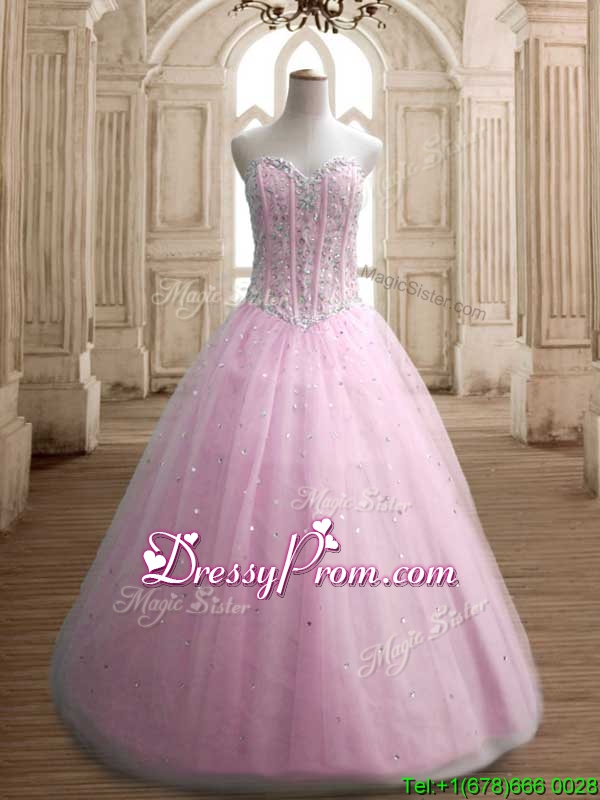 Neckline : SweetheartShown Color : Baby PinkSilhouette : A-lineSleeve Length : sleevelessHemline : floor lengthBack Detail : Lace upFabric : TulleEmbellishment : BeadingOccasion : Military Ball,Sweet 16,QuinceaneraSeason : Spring,Summer,Fall,Winter