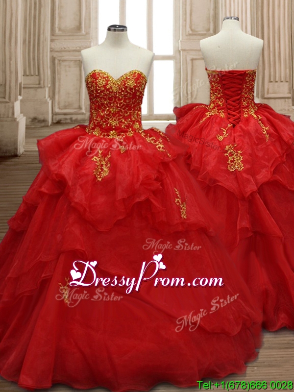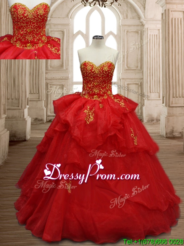 Neckline : SweetheartShown Color : RedSilhouette : Ball GownsSleeve Length : sleevelessHemline : high lowBack Detail : Lace upFabric : OrganzaEmbellishment : Beading,Ruffled LayersOccasion : Military Ball,Sweet 16,QuinceaneraSeason : Spring,Summer,Fall,Winter