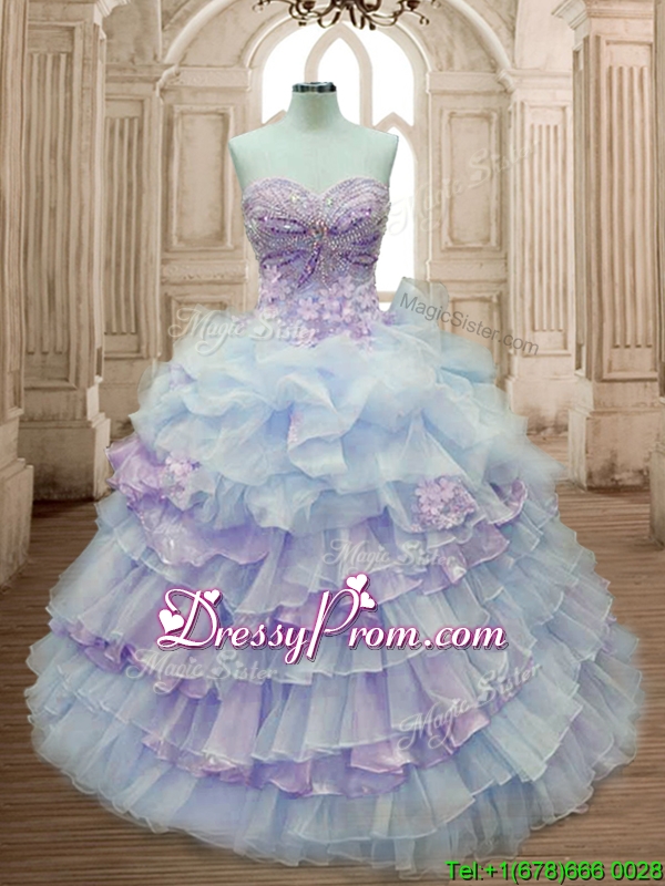 Neckline : SweetheartShown Color : Lavender,LilacSilhouette : Ball GownsSleeve Length : sleevelessHemline : floor lengthBack Detail : Lace upFabric : OrganzaEmbellishment : Beading,RufflesOccasion : Military Ball,Sweet 16,QuinceaneraSeason : Spring,Summer,Fall,Winter