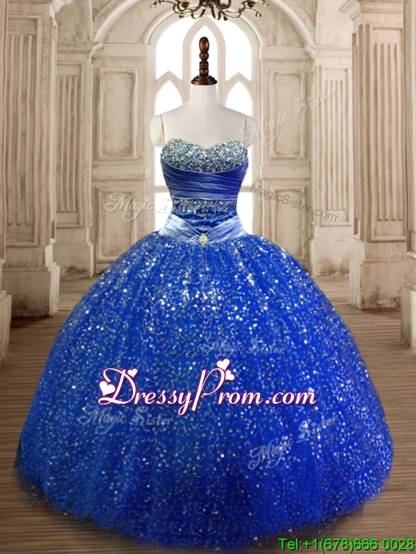 Neckline : SweetheartShown Color : Royal BlueSilhouette : Ball GownsSleeve Length : sleevelessHemline : floor lengthBack Detail : Lace upFabric : SequinedEmbellishment : Beading,SequinsOccasion : Military Ball,Sweet 16,QuinceaneraSeason : Spring,Summer,Fall,Winter