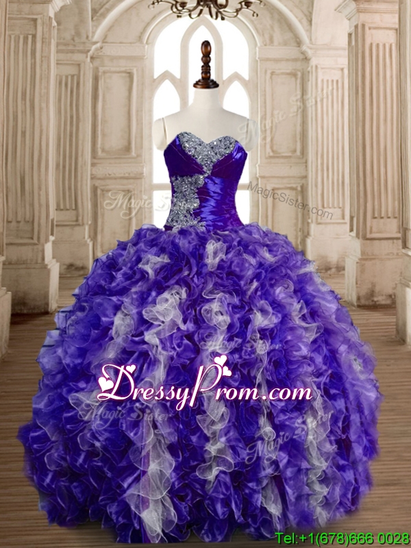 Neckline : SweetheartShown Color : White,PurpleSilhouette : Ball GownsSleeve Length : sleevelessHemline : floor lengthBack Detail : Lace upFabric : OrganzaEmbellishment : Beading,RufflesOccasion : Military Ball,Sweet 16,QuinceaneraSeason : Spring,Summer,Fall,Winter
