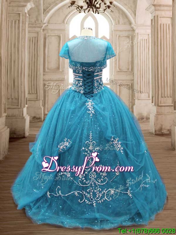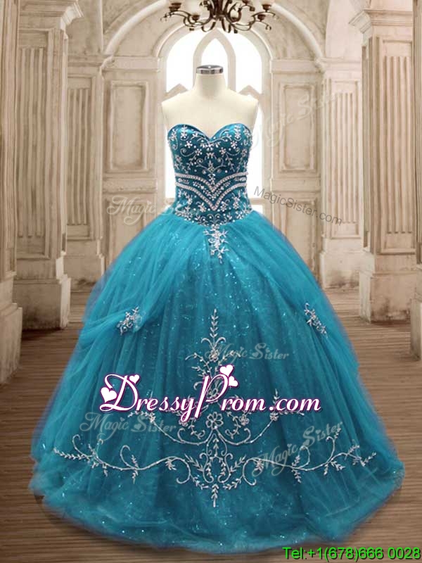 Neckline : SweetheartShown Color : Teal Silhouette : Ball GownsSleeve Length : sleevelessBack Detail : Lace upFabric : TulleEmbellishment : AppliquesOccasion : Military Ball,Sweet 16,QuinceaneraSeason : Spring,Summer,Fall,Winter