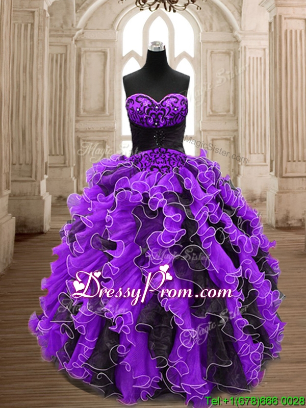 Neckline : SweetheartShown Color : Black,PurpleSilhouette : Ball GownsSleeve Length : sleevelessHemline : floor lengthBack Detail : BacklessFabric : OrganzaEmbellishment : Beading,RufflesOccasion : Military Ball,Sweet 16,QuinceaneraSeason : Spring,Summer,Fall,Winter