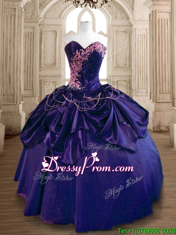 Neckline : SweetheartShown Color : PurpleSilhouette : Ball GownsSleeve Length : sleevelessHemline : floor lengthBack Detail : Lace upFabric : TaffetaEmbellishment : Beading,RufflesOccasion : Military Ball,Sweet 16,QuinceaneraSeason : Spring,Summer,Fall,Winter