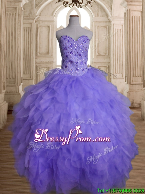 Neckline : SweetheartShown Color : LavenderSilhouette : Ball GownsSleeve Length : sleevelessHemline : floor lengthBack Detail : Lace upFabric : TulleEmbellishment : Beading,RufflesOccasion : Military Ball,Sweet 16,QuinceaneraSeason : Spring,Summer,Fall,Winter