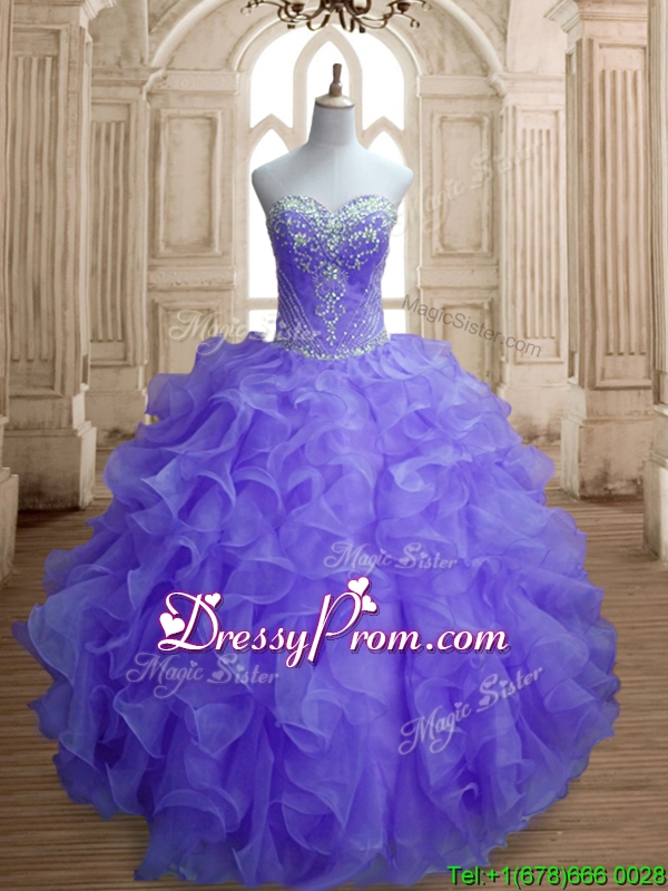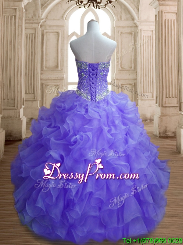 Neckline : SweetheartShown Color : LavenderSilhouette : Ball GownsSleeve Length : sleevelessHemline : floor lengthBack Detail : Lace upFabric : OrganzaEmbellishment : Beading,RufflesOccasion : Military Ball,Sweet 16,QuinceaneraSeason : Spring,Summer,Fall,Winter
