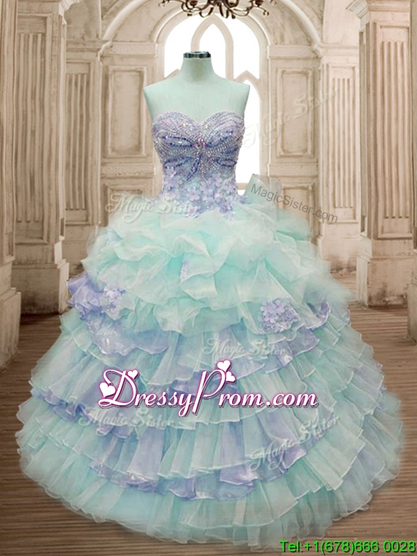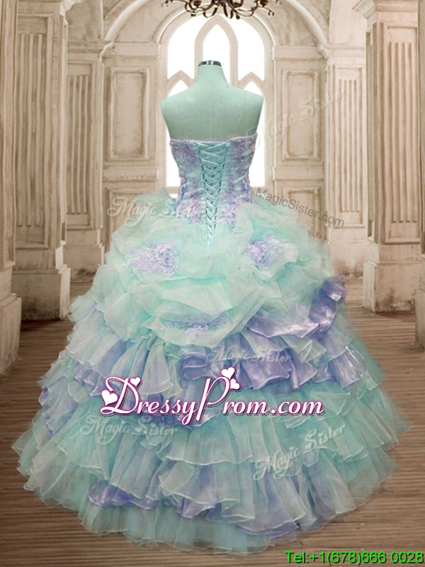 Neckline : SweetheartShown Color : Apple Green,LavenderSilhouette : Ball GownsSleeve Length : sleevelessHemline : floor lengthBack Detail : Lace upFabric : OrganzaEmbellishment : Beading,Ruffled LayersOccasion : Military Ball,Sweet 16,QuinceaneraSeason : Spring,Summer,Fall,Winter