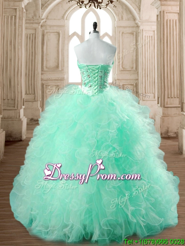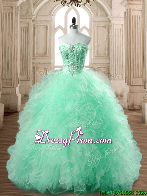 Neckline : SweetheartShown Color : Apple GreenSilhouette : Ball GownsSleeve Length : sleevelessHemline : floor lengthBack Detail : Lace upFabric : TulleEmbellishment : Beading,RufflesOccasion : Military Ball,Sweet 16,QuinceaneraSeason : Spring,Summer,Fall,Winter