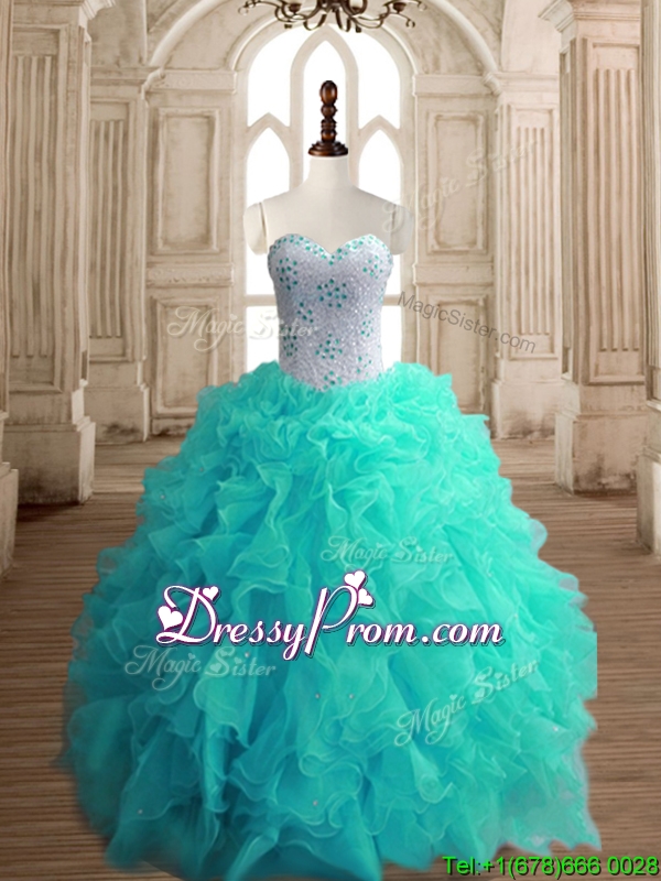 Neckline : SweetheartShown Color : TurquoiseSilhouette : Ball GownsSleeve Length : sleevelessHemline : floor lengthBack Detail : Lace upFabric : OrganzaEmbellishment : Beading,RufflesOccasion : Military Ball,Sweet 16,QuinceaneraSeason : Spring,Summer,Fall,Winter