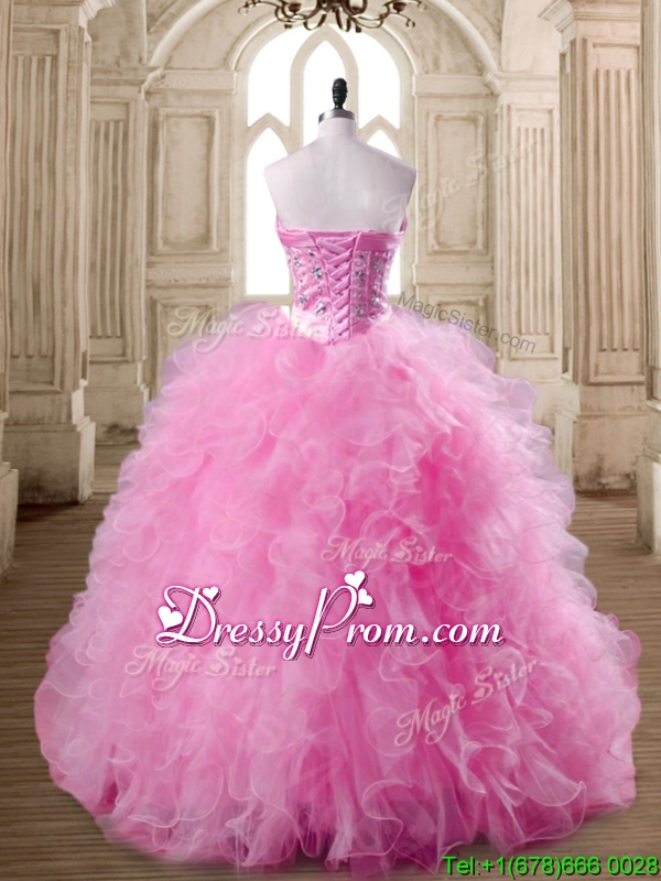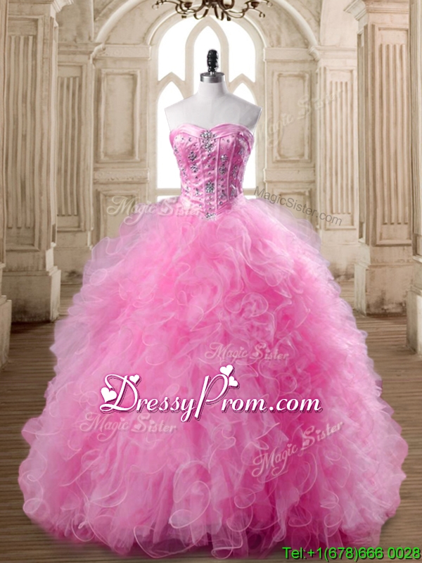 Neckline : SweetheartShown Color : Rose Pink Silhouette : Ball GownsSleeve Length : sleevelessHemline : floor lengthBack Detail : Lace upFabric : TulleEmbellishment : Beading,RufflesOccasion : Military Ball,Sweet 16,QuinceaneraSeason : Spring,Summer,Fall,Winter