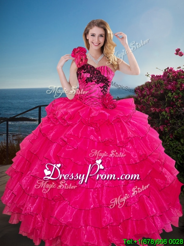 Neckline : One shoulderShown Color : Hot PinkSilhouette : Ball GownsSleeve Length : sleevelessHemline : floor lengthBack Detail : Lace upFabric : OrganzaEmbellishment : Ruffled Layers,Hand Made FlowerOccasion : Military Ball,Sweet 16,QuinceaneraSeason : Spring,Summer,Fall,Winter