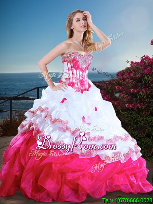 Neckline : SweetheartShown Color : Pink And WhiteSilhouette : Ball GownsSleeve Length : sleevelessHemline : floor lengthBack Detail : Lace upFabric : OrganzaEmbellishment : Beading,RufflesOccasion : Military Ball,Sweet 16,QuinceaneraSeason : Spring,Summer,Fall,Winter
