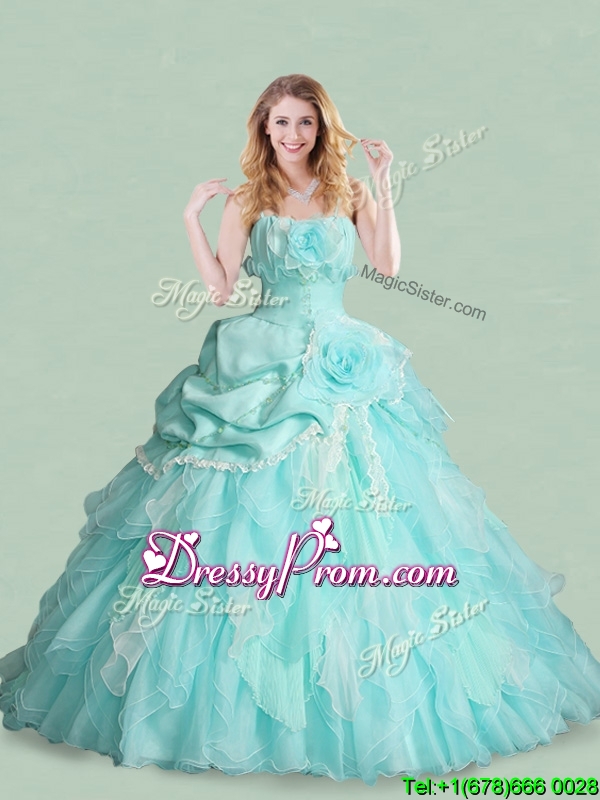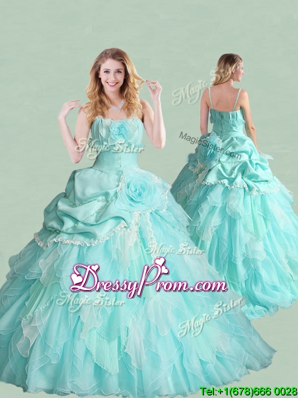 Neckline : Spaghetti straps Shown Color : Apple Green Silhouette : Ball Gowns Sleeve Length : sleeveless Hemline : with train Back Detail : Lace up Fabric : Organza,Taffeta Embellishment : Ruffles,Hand Made Flower Occasion : Military Ball,Sweet 16,Quinceanera Season : Spring,Summer,Fall,Winter
