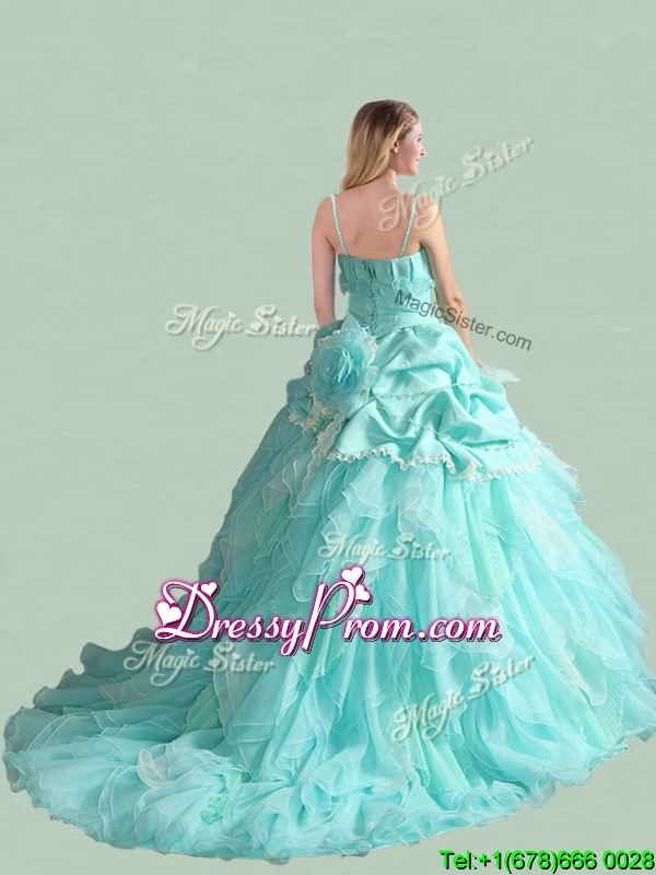 2016 Popular Spaghetti Straps Brush Train Quinceanera Dress with Handcrafted Flowers and Bubbles