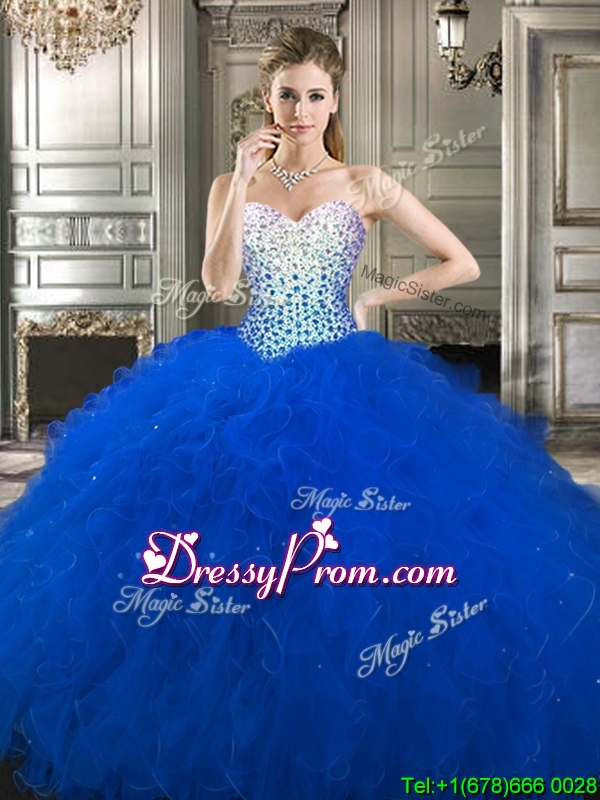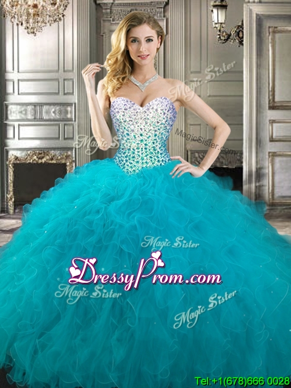 Neckline : SweetheartShown Color : Teal Silhouette : Ball GownsSleeve Length : sleevelessHemline : floor lengthBack Detail : Lace upFabric : TulleEmbellishment : Beading,RufflesOccasion : Military Ball,Sweet 16,QuinceaneraSeason : Spring,Summer,Fall,Winter