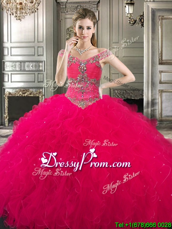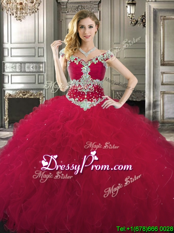 Neckline : Off the shoulder Shown Color : Wine Red Sleeve Length : cap sleeves Hemline : floor length Back Detail : Zipper Fabric : Tulle Embellishment : Beading,Ruffles Occasion : Military Ball,Sweet 16,Quinceanera Season : Spring,Summer,Fall,Winter